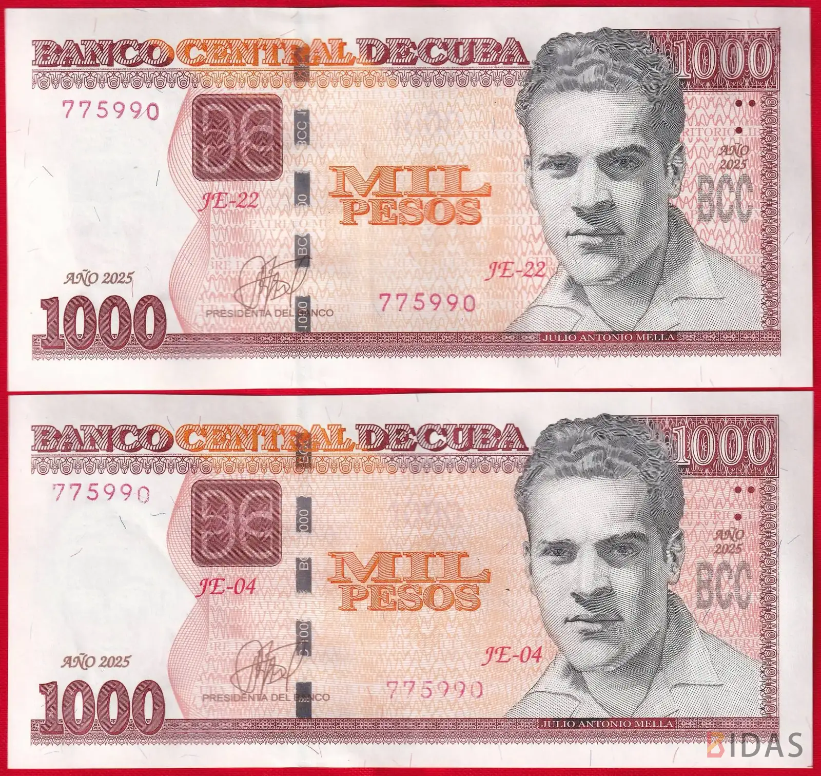Rinkinyje du banknotai iš JE-22 ir JE-04 serijų su vienodais numeriais.