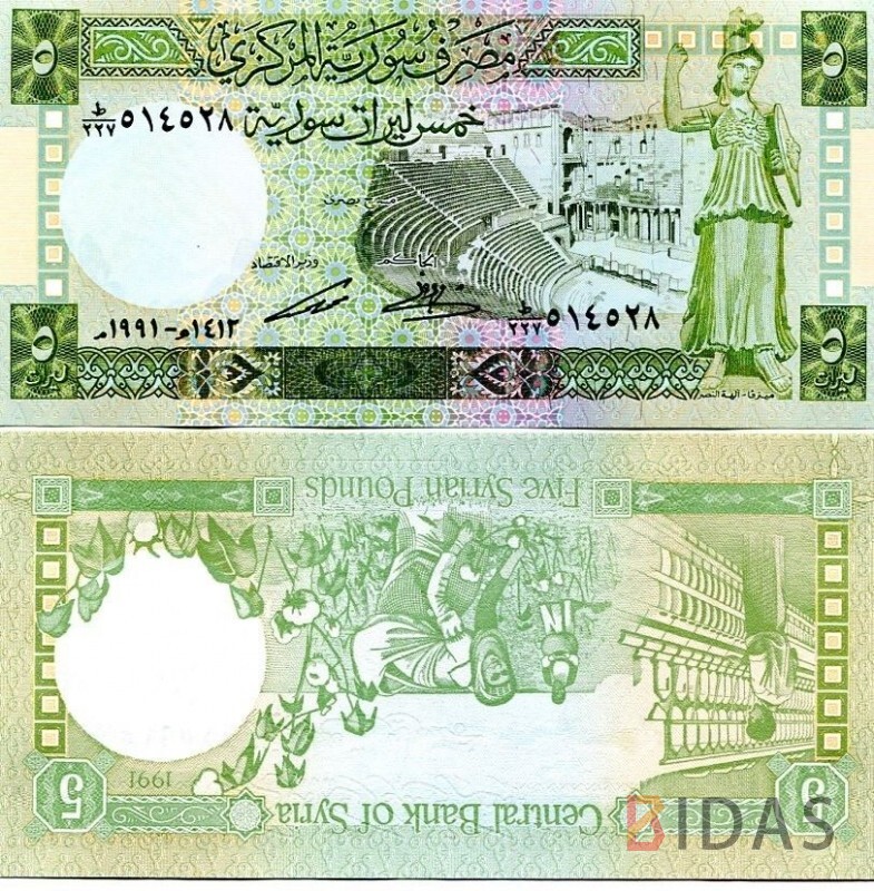 5 Pounds 1977-91/AH1397-1412. Dark green on multicolor underprint. Bosra theater