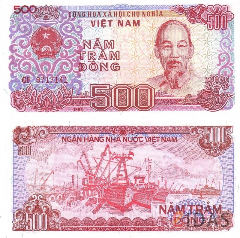 500 Dong UNC 1988 (1989). Red-brown and red on multicolor underprint.Ho Chi Minh at right, arms at left. Back: Dockside view. UV: fibers fluoresce yellow